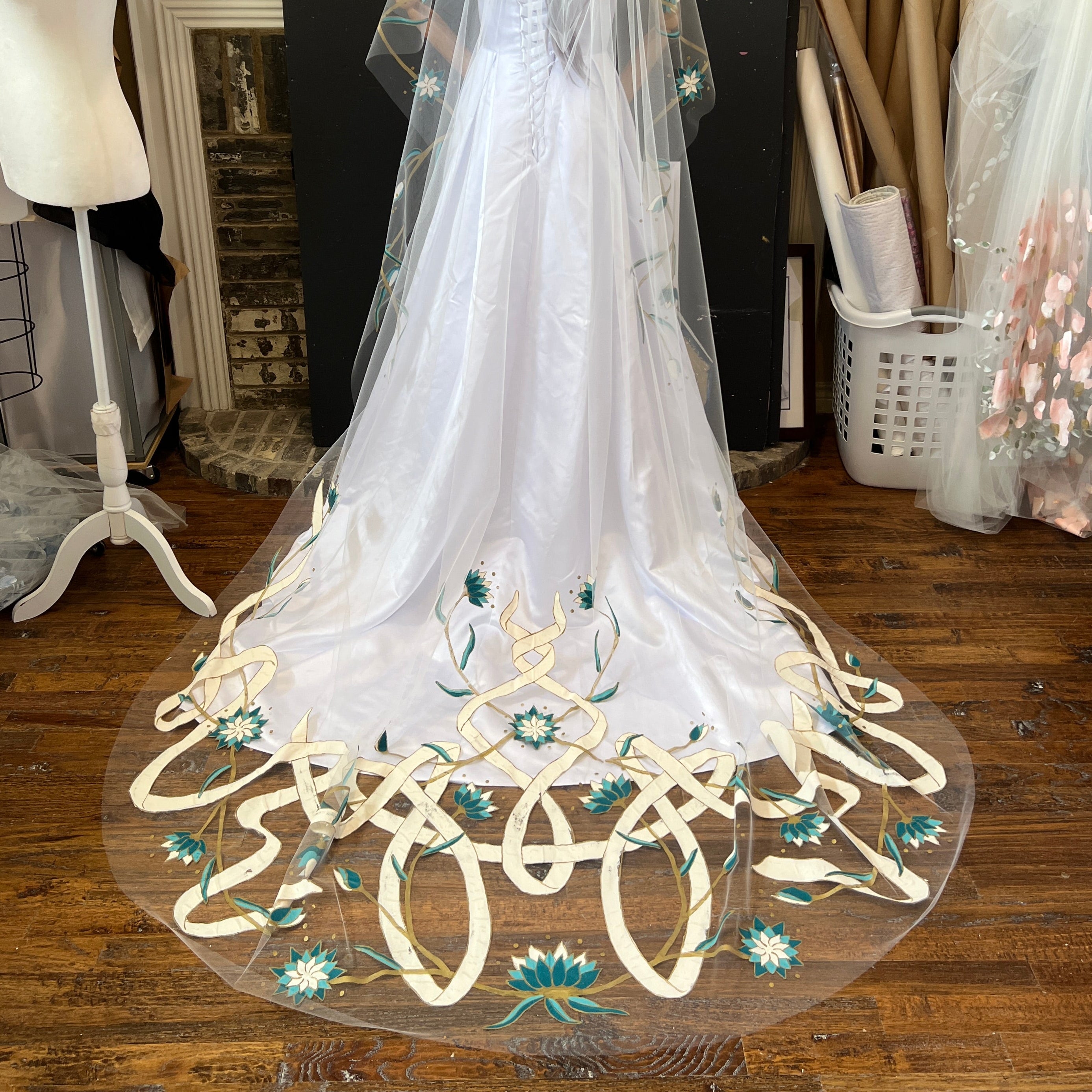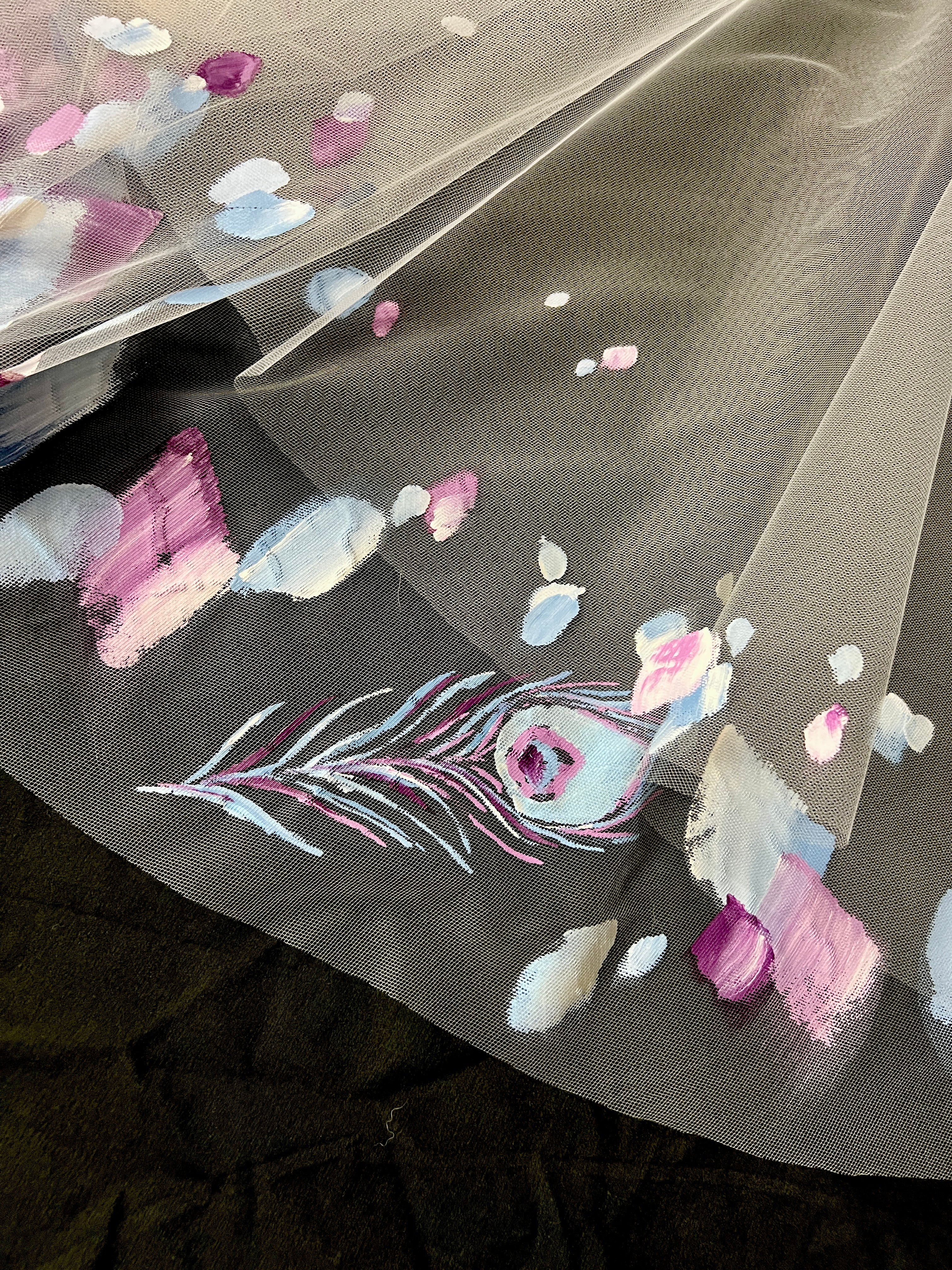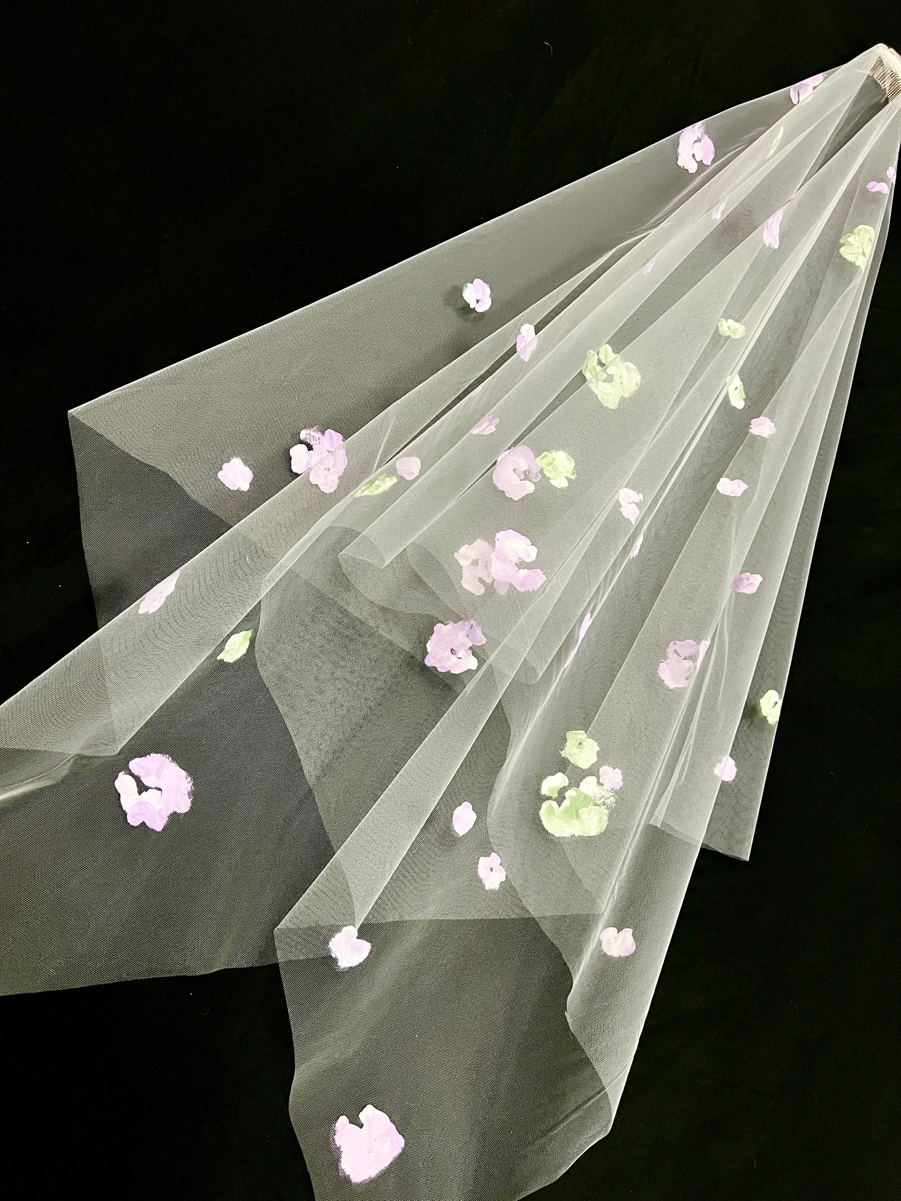 I can create fully custom artwork. I work with you to create 100% one-of-a-kind artwork for your specific veil. You can share inspiration images and thoughts, and we collaborate to design your veil.